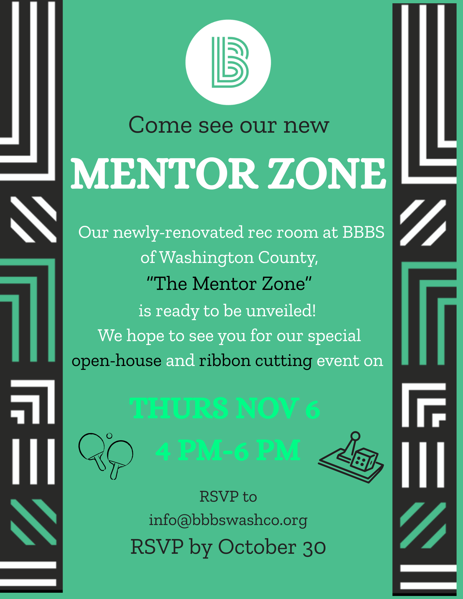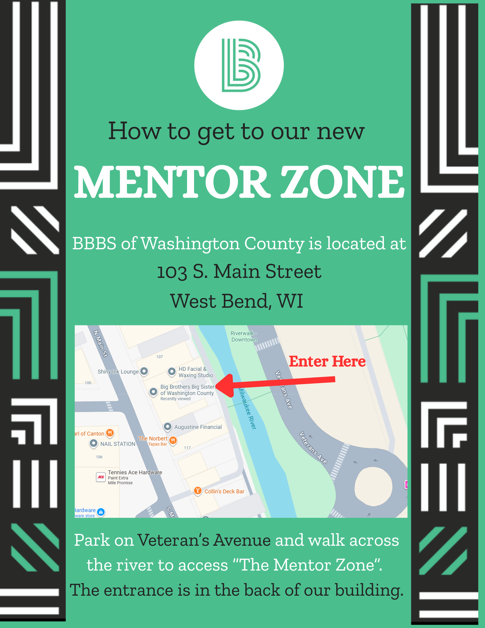 You are invited to join Big Brothers Big Sisters for an Open House and Ribbon Cutting of our new Mentor Zone space on Thursday, Nov. 6th from 4-6pm. The Tree Lighting Ceremony in downtown West Bend is at 5:30pm, so come early and enjoy both events! Learn more about what being a mentor is all about and celebrate the power of mentorship and view the renovated Mentor Zone space as well as the renovated Big & Little mural along the Riverwalk!